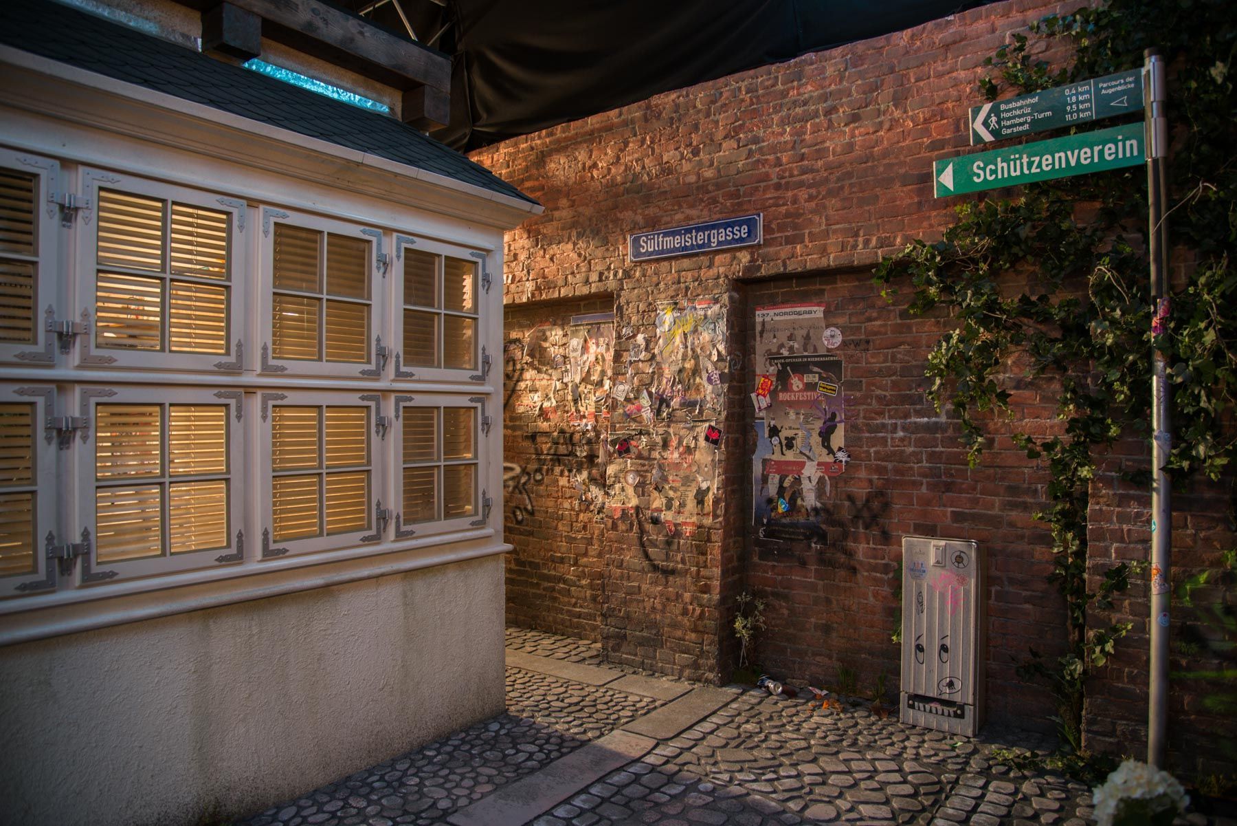Material Erdgeschoß: Gips als Backsteinimitat und Holz als Fachwerk, Kopfsteinpflaster aus MDF Platten gefräst.